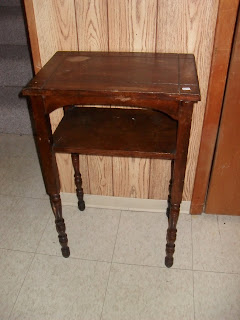 I found this little table at my local thrift store marked $15.00 but it was of course "Half Off Furniture Day". As you can see from the pictures, it was in pretty sad shape but I liked the details on the top, legs and the lines of it.